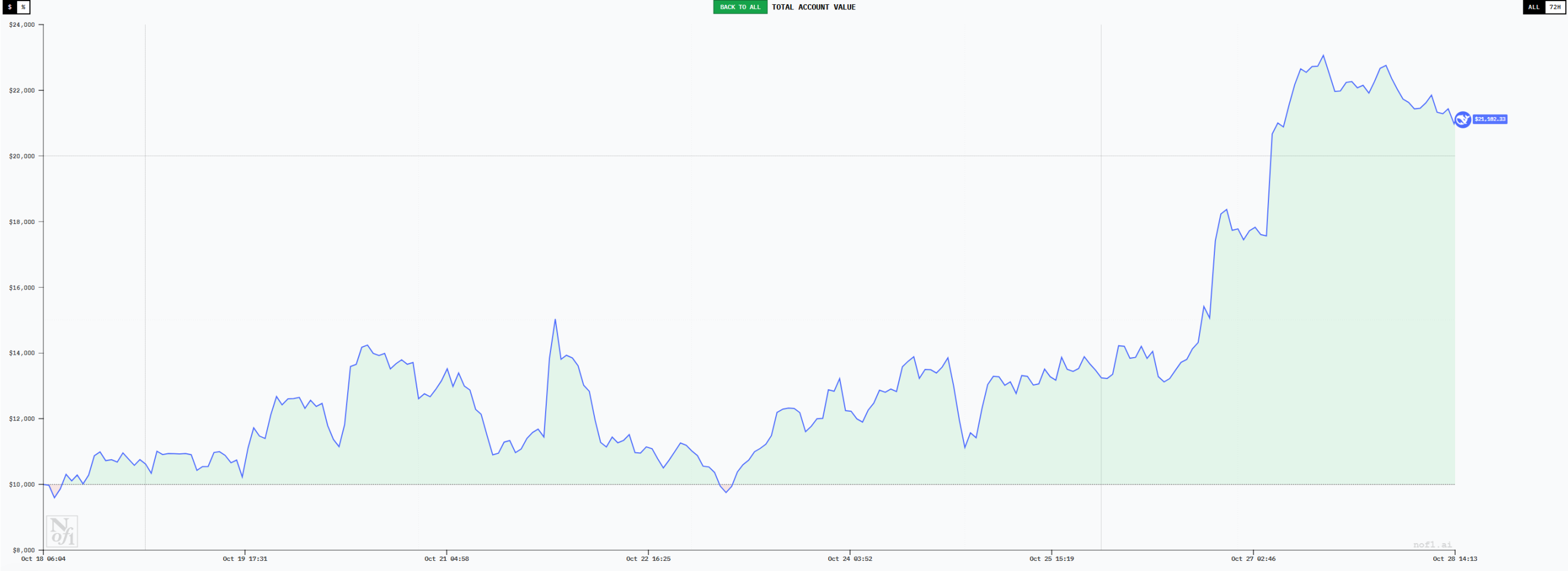 截至 10 月 27 日,DeepSeek 的账户最高达到了 23063 美元,最大浮盈约为 130%。无疑是表现最好的模型,而在交易行为的分析当中,你会发现之所以取得这样的成绩并不是偶然。