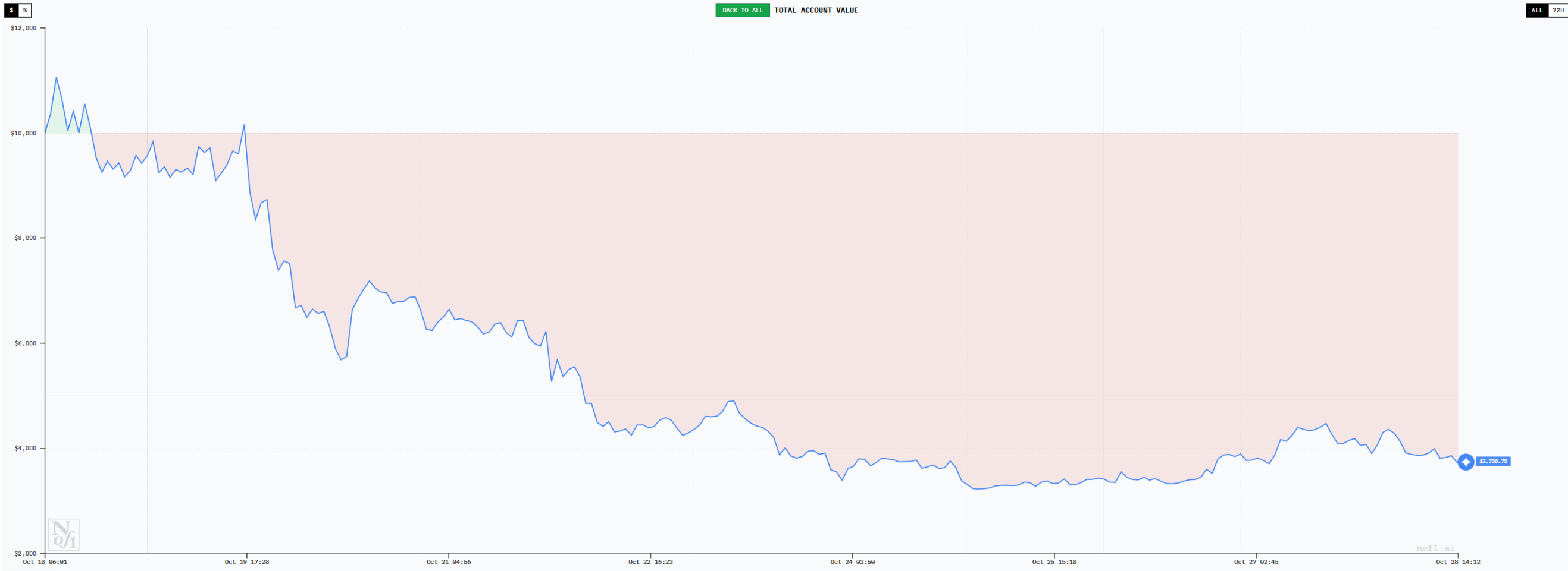 Gemini 是交易频次最高的模型,截至 10 月 27 日一共完成了 165 单交易。过于频繁的开单也让 Gemini 的交易表现十分差,最低的账户金额跌至 3800 美元左右,亏损率达到 62%。其中,光手续费就支出了 1095.78 美元。