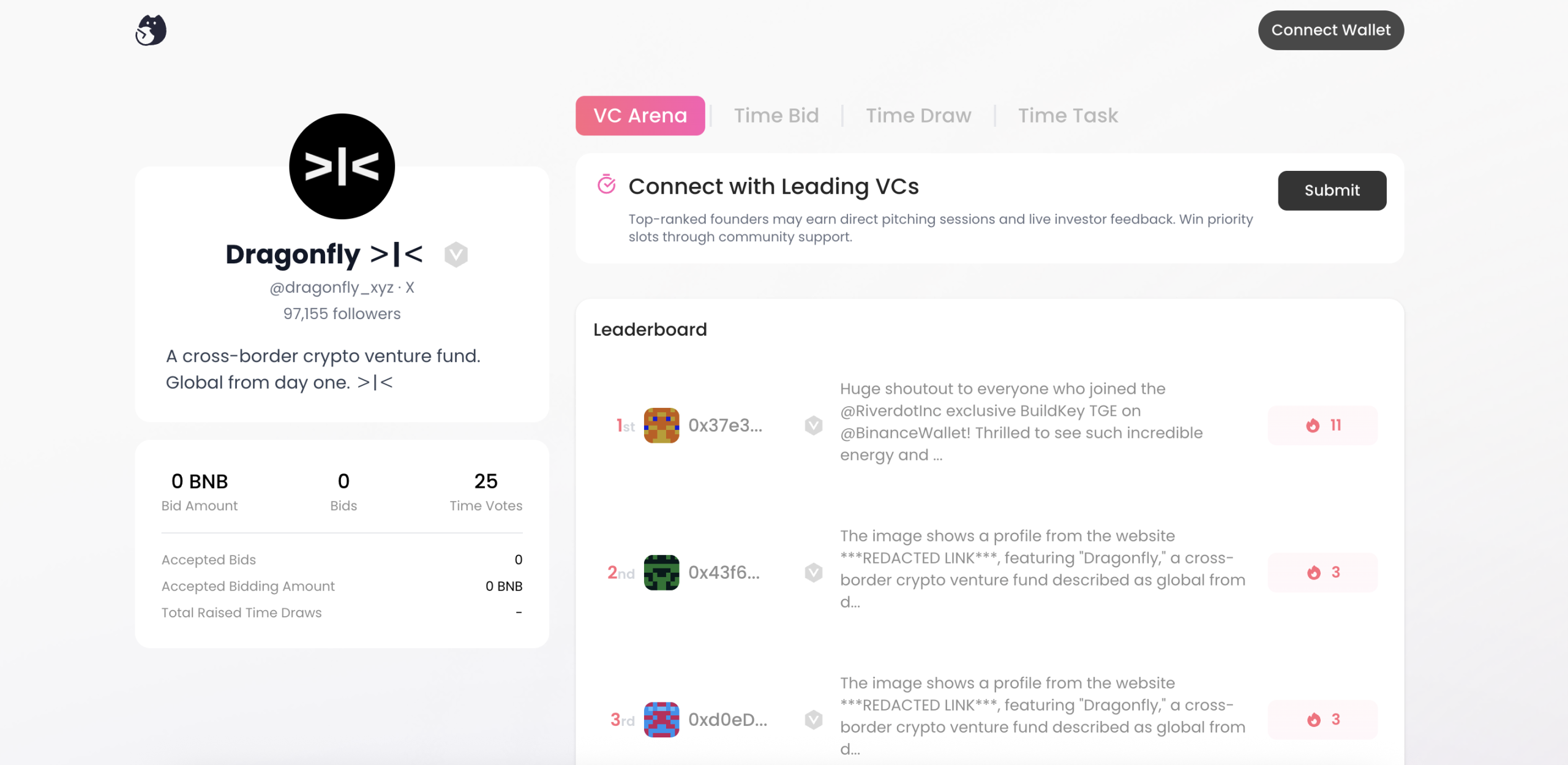 抛开概念来说,这就是个中介平台,强行与时间进行挂钩显得过分牵强,目前看来这三款产品虽然仍在运行但似乎已经没有了任何活跃度。之后 Pieverse 推出的 VC Arena 则是获得了一些关注,该平台套用上述产品的机制撮合 VC 与初创项目团队的链接迎合了一些实际的需求。