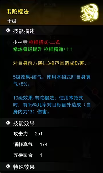 对近身4格范围造成伤害, 不消耗真气;所有少林寺枪棍招式伤害+10%。