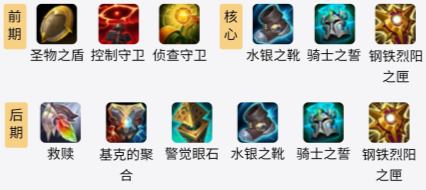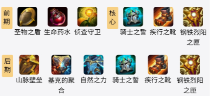 中期:钢铁烈阳之匣这件装备可以给队友提供一个护盾,且在队友身边还可以增加其双抗,骑士之誓可以将队友受到的一部分伤害转移到自己的身上。