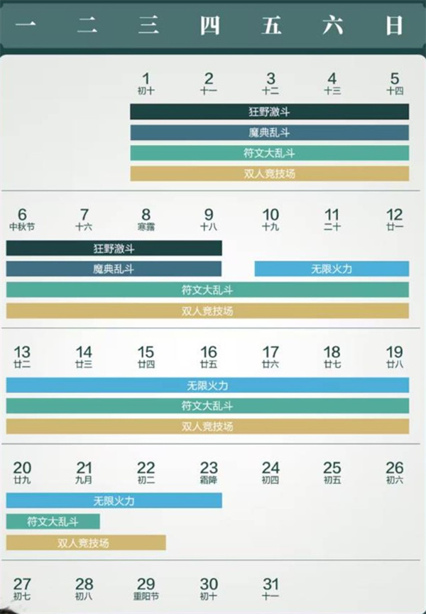 在《英雄联盟手游》中,娱乐模式一直是玩家休闲放松的热门选择。官方公布了2025年10月的模式轮换日历,包括无限火力、符文大乱斗、双人竞技场等多种玩法,玩家可以根据时间安排体验不同的乐趣。