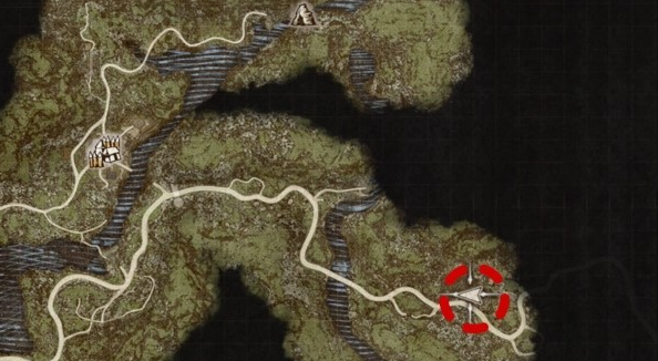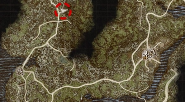 在主路附近一棵倒下的树干旁边。在国境监视兵团营地东边。