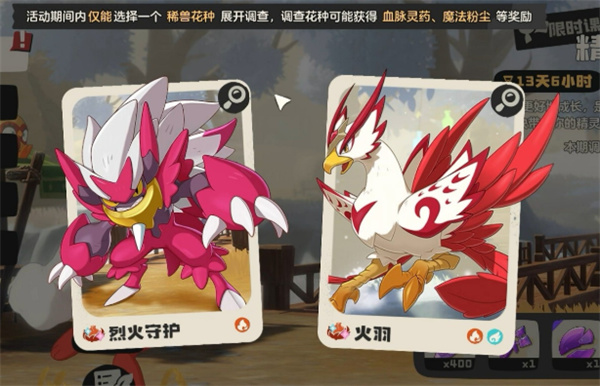 1、活动开启后,在可供调查的两种精灵中选择火羽(烈钻鸟最终形态)。