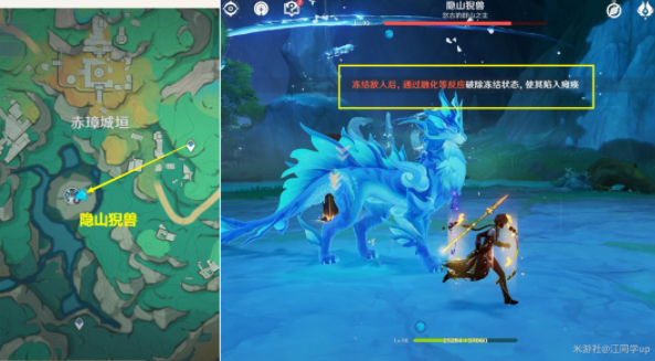 1、玩家来到boss【隐山猊兽】这里,打一会后,屏幕中间就会提示【冻结敌人后,通过融化等反应破除冻结状态,使其陷入瘫痪】;