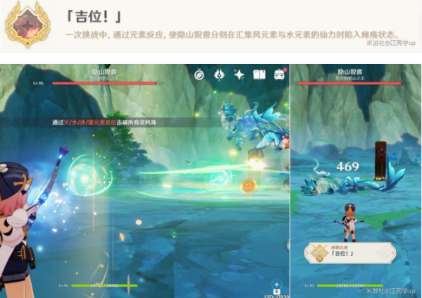 成就描述:一次挑战中,通过元素反应,使隐山猊兽分别在汇集风元素与水元素的仙力时陷入瘫痪状态。