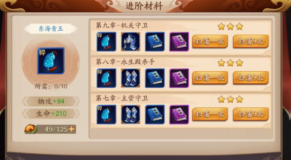 4.武将进阶是需要消耗材料的,进阶的装备可通过普通的副本获得,进行副本的扫荡。