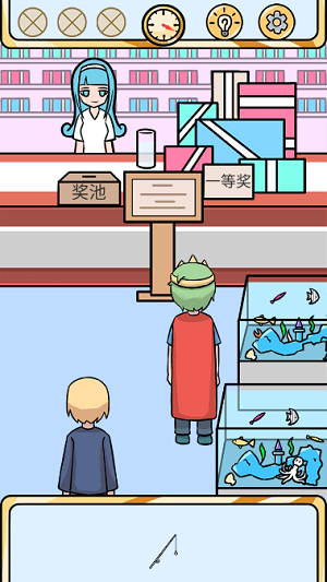 1.把柜台右边立着的鱼竿拿下来,在上面的鱼缸里拿到一个扇贝,与鱼竿一起组合,用钓鱼竿在下面的鱼缸里钓一只墨鱼,点击柜台上的水杯,和墨鱼组合成一杯墨鱼汁,给主角喝,然后去抽奖;