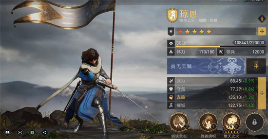 统帅三军系列的辅助回复英雄,可以帮助队伍回复军力,可以和影武者、魏兰组成一个前期过渡阵容,中期通过活动获得尤里乌斯之后将魏兰代替获得统帅风格加成。