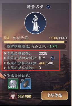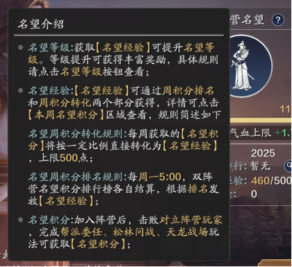 (1)那么怎样获取名望积分呢?加入阵营后,击败对立阵营的玩家,或完成帮派委任、松林问战、天龙战场玩法,即可获取名望积分;每周获取的名望积分会按一定比例,上限500点的形式转化成名望经验;名望经验由周积分排名和周积分转化两个部分获得,获得的名望经验可以提升我们的阵营名望等级并得到相应的奖励。