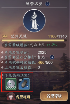 那么提升阵营名望等级可以获得哪些奖励呢?首先是道具奖励,每当名望等级首次达到新的等级之后,即可获得一次性的银币和天涯令奖励;