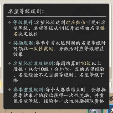 阵营名望等级是有时间和等级限制的,名望等级达到14级以上之后,将由名望排名决定段位;每个大赛季结束时会重置你的名望等级、经验和一次性奖励的领取资格,并在赛结束时,根据你的段位给予一次性的段位奖励。