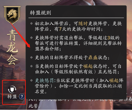 另外,阵营也是可以更换的,但是需要满足一定的限制条件。例如:更换阵营后的7天内不可再次更换、更换的目标阵营状态不得处于鼎盛,更换阵营后会一定比例的扣除当周获取的江湖名望等等。