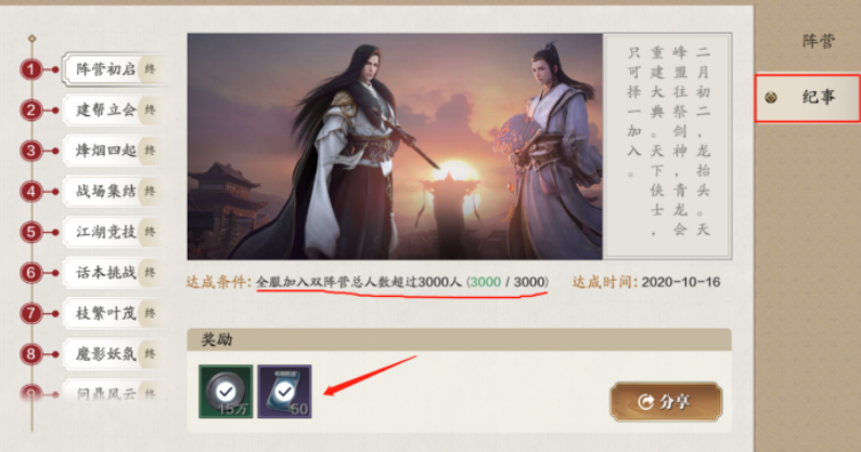 在纪事玩法中,换种说法可以将其称为阵营成就。里面记录着各阵营之间一起完成的任务,并给予一定的绑定点券和其它道具奖励。这个纪事系统里记录的一些任务,完成需要自己所在服务器里所有人的共同努力,所以能获得多少奖励,大家尽力就好~