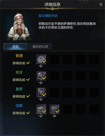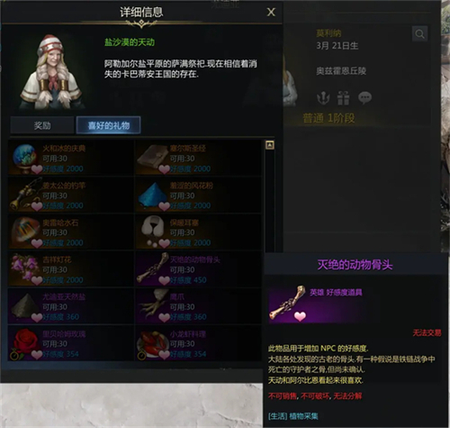 喜欢的礼物:盐沙漠的天动最喜欢的礼物是灭绝的动物骨头,这个道具可以通过生活技能植物采集概率获得,如果喜欢采集并且有一些存货,可以考虑送给盐沙漠的天动,这样最赚;