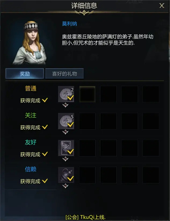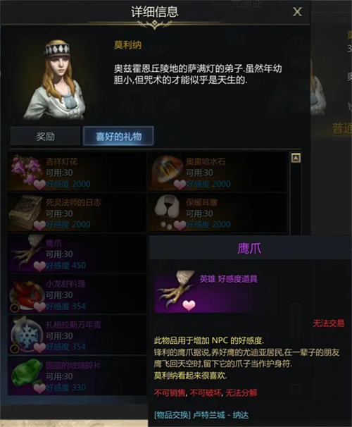 喜欢的礼物:莫利纳最喜欢的道具是鹰爪,这个可以在卢特兰城的好感度兑换处兑换,然后给莫利纳赠送,一个+450的好感度;