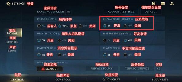 3.在设置界面中选择常规界面,常规界面右边的第一栏“DISPLAY MATCH RESULT”就是历史战绩的开关;