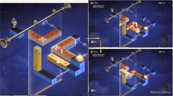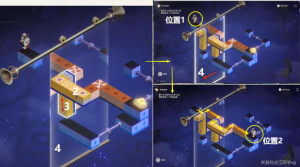 2)接着将3黄色模块向上拖拽移动到下图位置,最后将4镜子拖拽移动到下图位置后, 【钟表小子】就会从位置1自动跑到位置2,解密完成