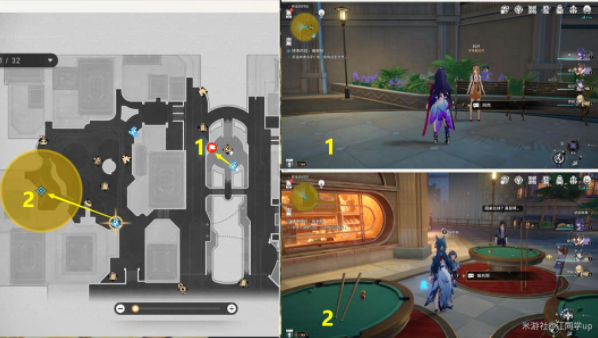 2)接着追踪任务去下图1、2位置对完话,该任务结束,就能获得【W?】贴纸了