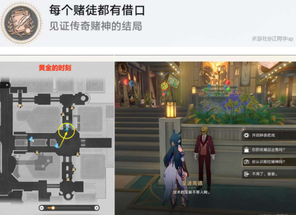 5)最后再来到【黄金的时刻】下图这里找【斐迪南德】对话选择【你认识那位赌神吗?】,继续对完话后,就能获得【无信号】贴纸了,同时获得隐藏成就《每个赌徒都有借口》,属于【与你同行的回忆】