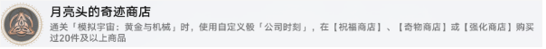 成就描述:通关「模拟宇宙:黄金与机械」时,使用自定义骰「公司时刻」,在【祝福商店】、【奇物商店】或【强化商店】购买过20件及以上商品。