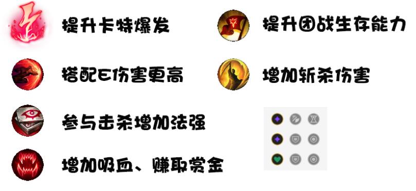 符文的搭配上,电刑已然是一个最佳的选择,可以提升卡特在连招时的爆发能力,以便可以很好的展开秒杀,尤其是电刑和致命一击配合暗夜收割的爆发伤害很高。