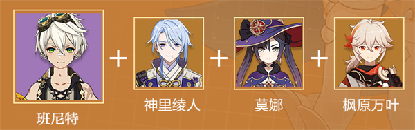 万叶的聚怪配合莫娜的嘲讽能够提供相当优秀的输出环境。万叶+绫人的小技能COMBO也可以足够处理残血小怪,输出灵活。班尼特为全队提供治疗与攻击力加成。