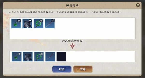 7.师徒传承-师父需要在师徒面板中点击弟子头像后选择“师徒传承”,将多余的装备母本通过邮件传送给弟子;