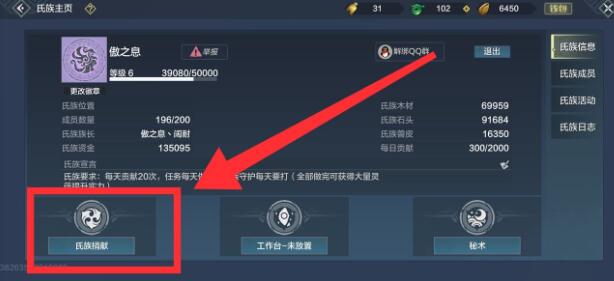2.氏族中还能进行捐献,捐献物品中分别是文贝捐献、高级捐献、物质捐献三种捐献,木头和石头在氏族拥有很多后就不要捐献了,可以选择文贝捐献和高级捐献;