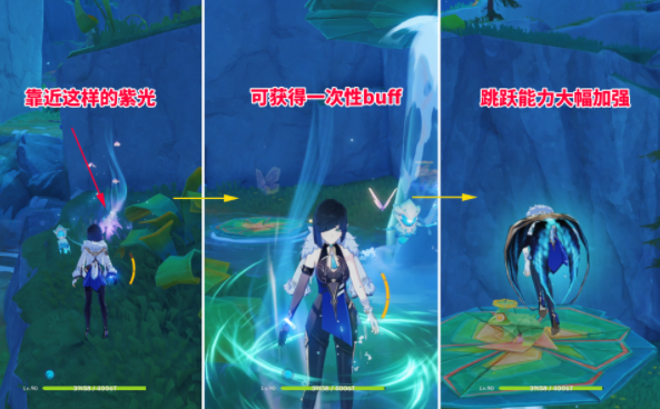 3、随后靠近「阿绿」,按“T”操控魔线,此时,角色可左右移动调整方向;前后移动拉长魔线调整跳跃长度(注意看光圈位置,光圈代表「阿绿」跳跃落地位置),按「攻击键」可释放「阿绿」,使其跳跃至下一片荷叶;