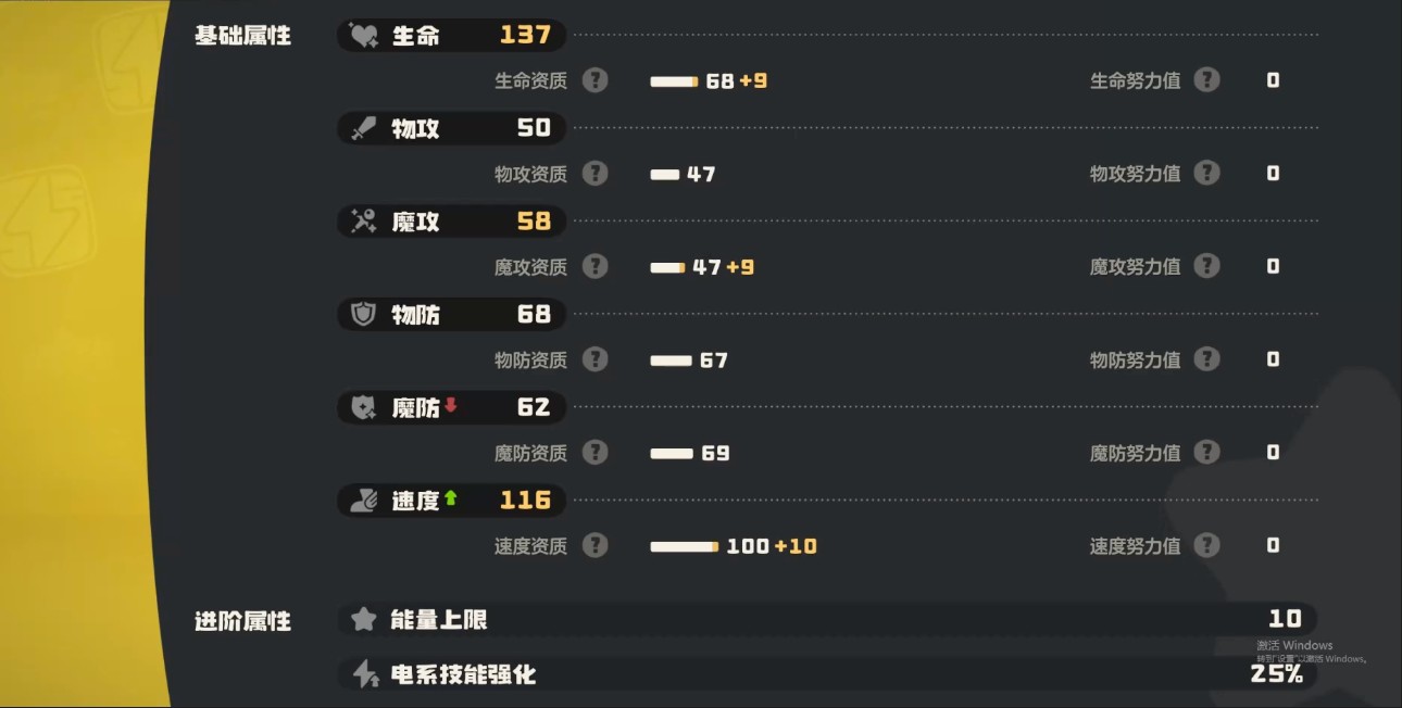 先看看粉咩咩的快充技能,这个特性能让粉咩咩离场获得能量10点。粉咩咩有很多精灵技能,下面将一一介绍:落星是个物攻技能,能对敌方精灵造成40点物理伤害。猛烈撞击也是物攻,能造成60点物理伤害,是个比较直接的攻击手段。球状闪电同样是物攻,60点物理伤害,带着电属性的攻击效果。粉咩咩还有个防御技能,能减伤80%。