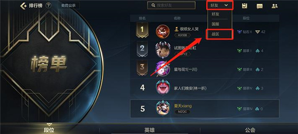 2、在排行榜单界面中,右上角的位置有一个好友选项,点击后会有战区选项,选择战区;