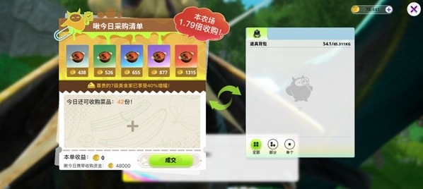 在大地图上可以看到各种农场,在农场的啾啾那里除了可以买到各种农作物,还可以根据采购清单来制作烹饪进行售卖,这种方法相比直接卖材料可以获得更多的金币,但是相对我们也需要付出一定的劳动。