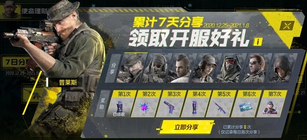 连续将该活动分享给好友,可获得全部奖励,有烟雾弹-庆典、贴纸-庆典、MW11-庆典、闪光弹-庆典、M16-庆典、中级武器经验卡、突击队员3号-庆典;