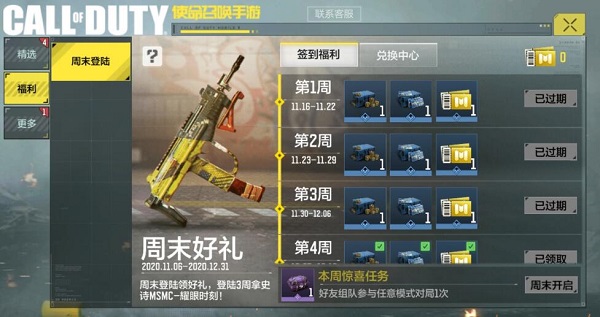 周末时间登录游戏,可领取金币宝箱,经验卡包箱及兑换券,还会额外赠送集结福利宝箱,当集齐3张兑换券可兑换史诗级MSMC。