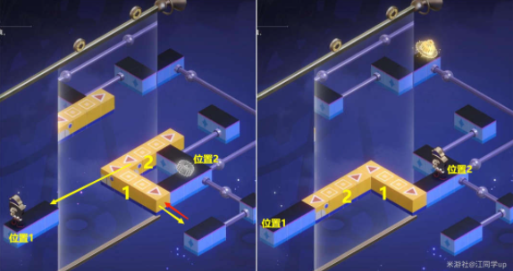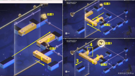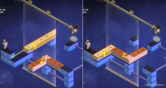 (2)将1黄色模块移到右上,将2镜子移动往右下移动,使3位置拼接到一块(形成一个直角道路),【钟表小子】会从位置2到位置3,解密完成。