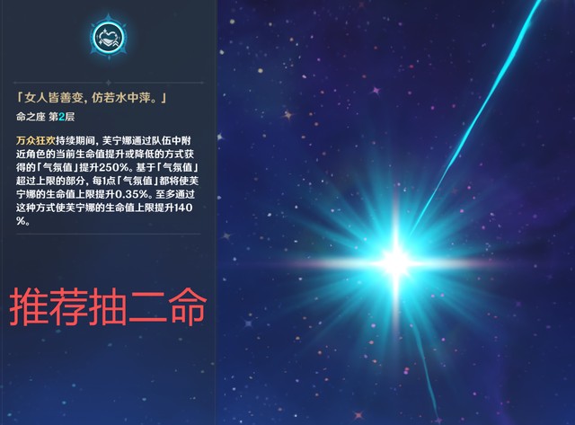尤其是0命的芙芙,你首先得满足4万血的基础,吃满天赋“无人听的自白”的效果,圣遗物一般都推荐生生暴。2命之后,才可释放4万生命值要求,可以充水暴,也可以充生暴。有条件的朋友,至少抽个2命。没条件的朋友,0命都得抽一个,真的百搭,至于再往高了去,其实没必要推荐了,平民玩家够不到,氪佬玩家随意抽。