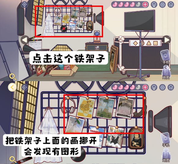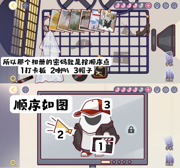 3、这些照片就是密码,玩家可以按照顺序来查看,密码就是1打卡板,2喇叭,3帽子。
