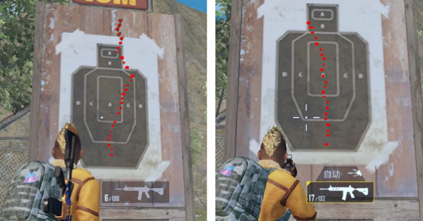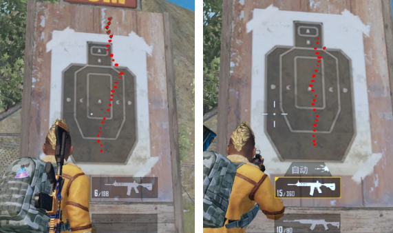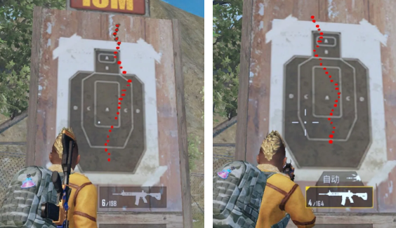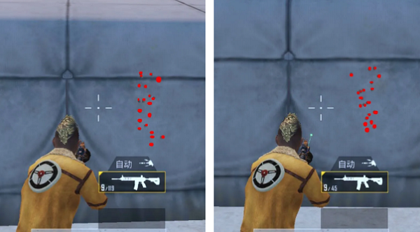 (2)以配有瞄准镜和快速扩容弹匣的M416为例,装备上垂直握把后可以明显看出每一发子弹落点之间的垂直间距相对于没有握把的要更为紧密,垂直方向的后坐力得到改善;