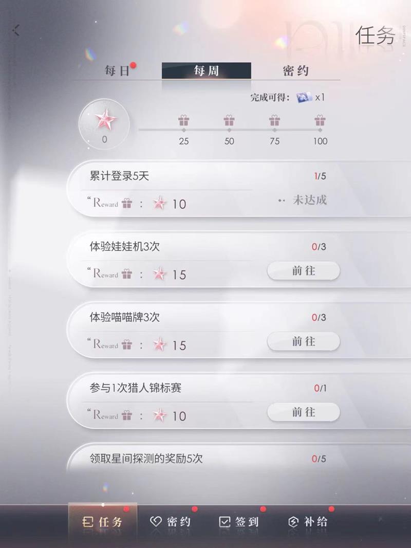 完成每周任务是获取极空许愿券的稳定途径之一。玩家每周只需完成部分任务,比如登录五天、体验娃娃机和喵喵牌等小游戏,就能轻松达到100活跃度,从而领取一张极空许愿券。恋与深空的每周任务种类丰富,玩家可以根据自己的时间选择性完成。