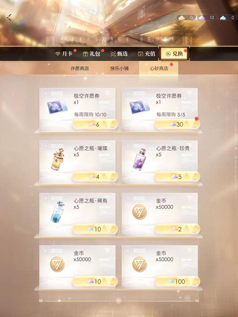 当玩家抽到重复卡牌时,会获得心砂资源。在商城的兑换界面,玩家可以用6个金色星砂或30个紫色星砂兑换极空许愿券。需要注意的是,每周兑换数量有限制,建议玩家及时使用溢出的星砂进行兑换。