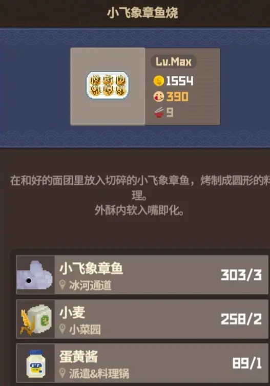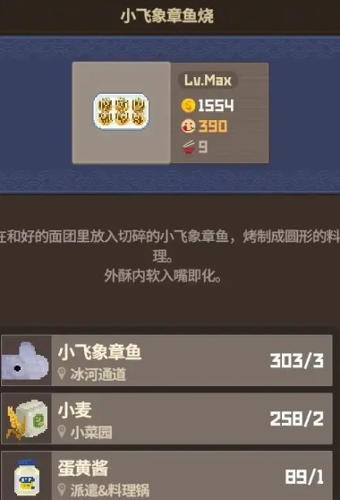这里以小飞象章鱼烧为例,最上方往下依次是售价(1554),美味度(390),份数(9),以及需要用到的材料份数,以及来源。