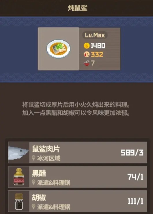 鲨鱼派对这道菜需要派遣起来之后,优势是鼠鲨超级容易获得不需要种菜,一次三星捕获就是27块肉,而且拉乌尔使我们毕业厨司之选,升级不亏。
