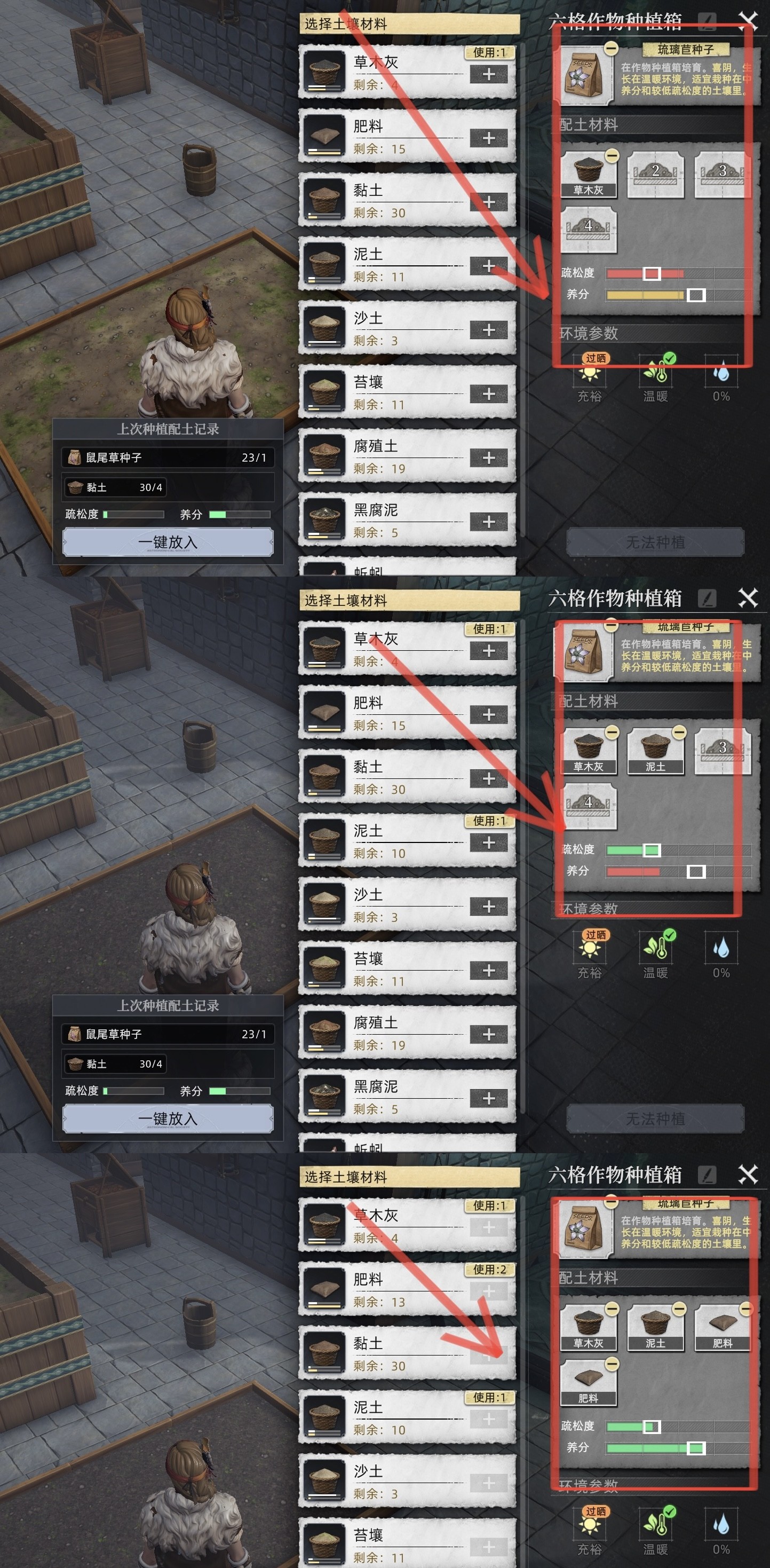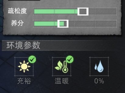 这里放「泥土」是因为它的疏松度和营养进度条是一致的方便调节,而且不算低在 20% 左右,这里就不放图了,大家自己游戏里看。