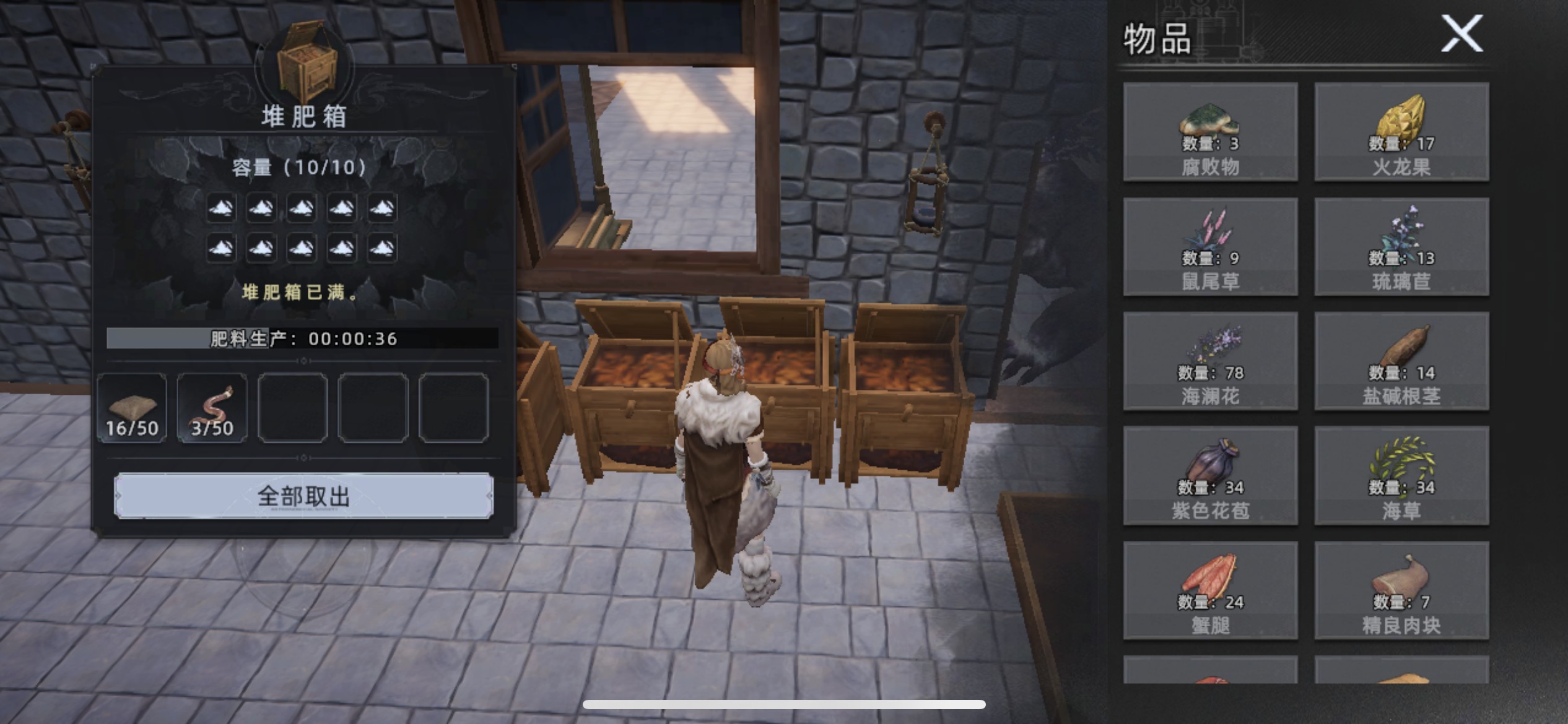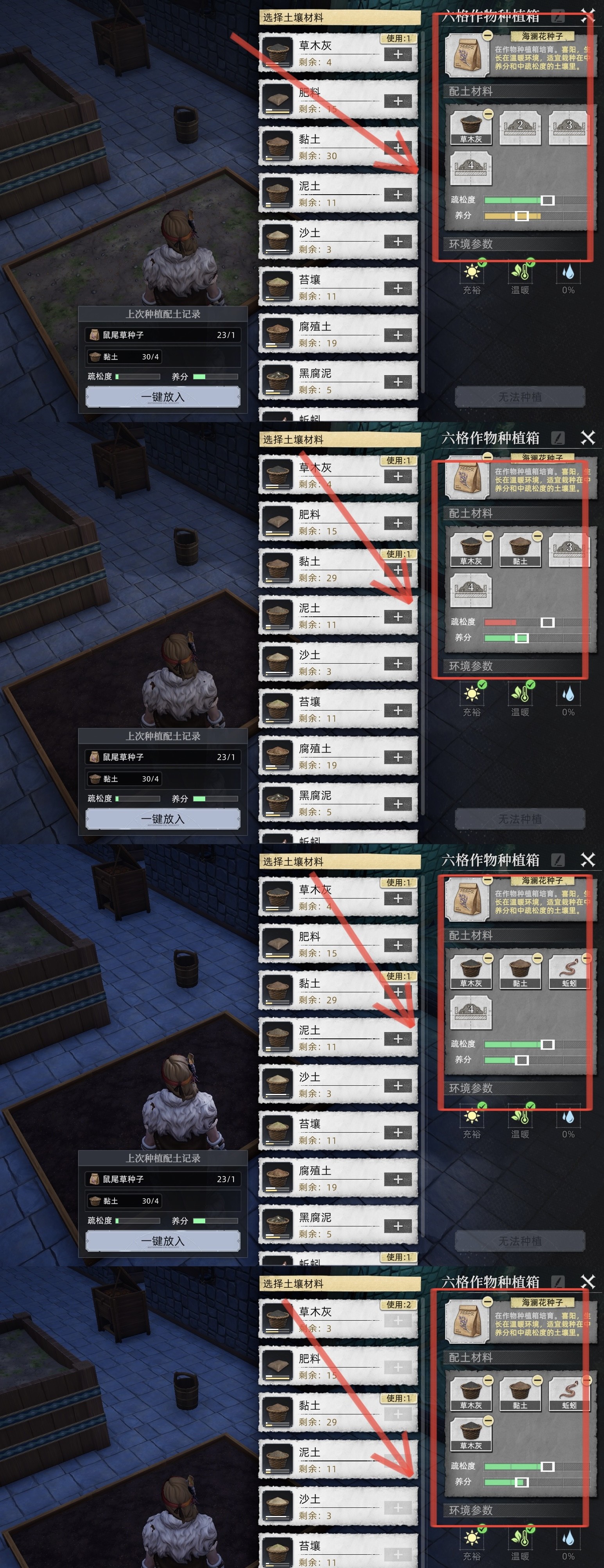 这时候放个「泥土」平衡,疏松度低了放条「蚯蚓」调节。最后再放 1 个「草木灰」