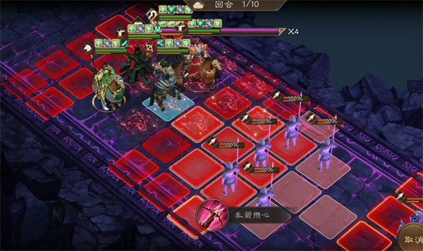 第一回合下方,刘备开辅助为大家加增益,关羽突袭斩杀对面两个敌人二动放群攻技能斩杀三个敌人,吕布前进普攻斩杀下方最后一个小兵,貂蝉再动吕布,吕布前进到上图位置↑放群攻技能。下方其余武将前进,注意不要踩到红色格子。