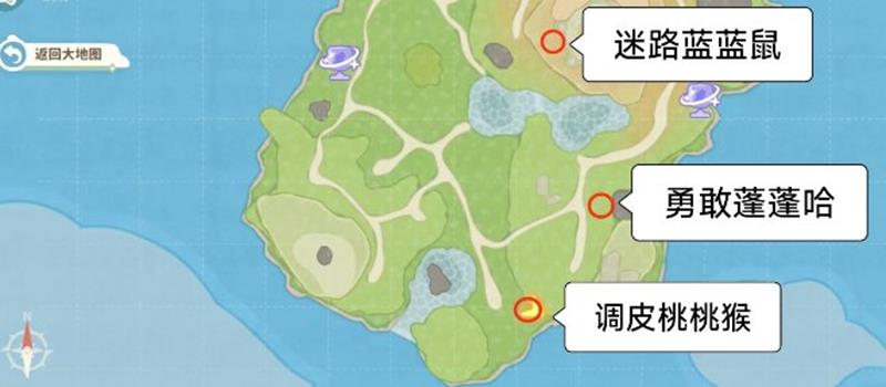 在米姆米姆哈中,特殊米姆的捕捉位置各有不同。勇敢蓬蓬哈、调皮桃桃猴和迷路蓝蓝鼠是游戏中比较受欢迎的特殊米姆,它们的捕捉位置如图所示。玩家需要提升角色相关技能并携带合适的捕捉道具,这样可以大大提高捕捉成功率。