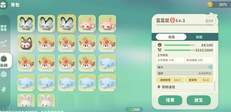 例如,蓬蓬哈的特性为牧羊犬+2攻击、警觉+2防御、-10%心情下降速度;桃桃猴的特性是玩+5生命、-10%工作效率跑路+15%移动速度;蓝蓝鼠的特性包括迷路体质+10%移动速度、+10心情下降速度、爱哭鬼+8%浇水速度、-10防御。