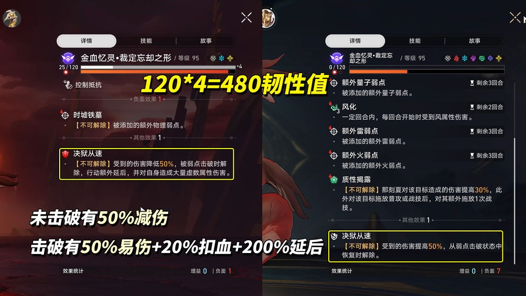 裁定忘却之形未击破前有50%减伤,击破后50%易伤+扣血20%+行动延后200%。480长度韧性条,非击破队怎么打呢?走机制!战斗中用护盾抵挡它技能,或消灭召唤物都可让BOSS削减60点韧性条。