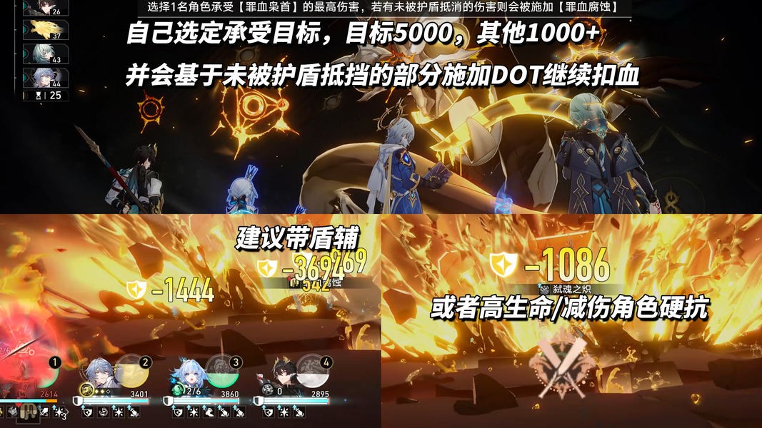 对局中唯一需要注意的技能来了!当BOSS指定1名角色施放“罪血枭首”时,建议选择血量最高的角色来承受,后续将承受5000左右的伤害,并根据未被护盾抵挡的伤害值继续施加DOT扣血。